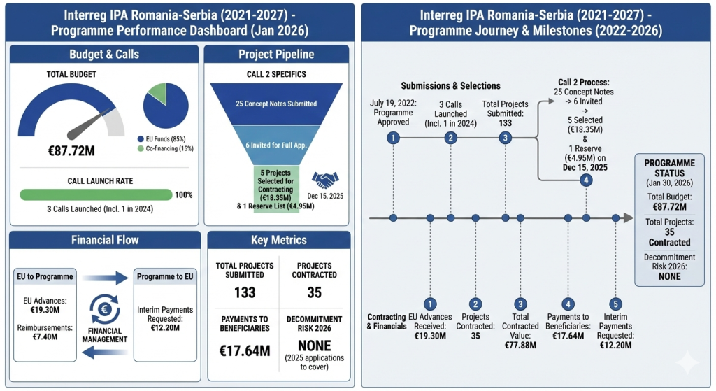 Programul Interreg IPA România-Serbia (2021 – 2027)aprobat de către Comisia Europeană în data de 19 iulie 2022[1] cu un buget total de 87,72 mil. euro (din care 74,56 mil. euro fonduri UE):
